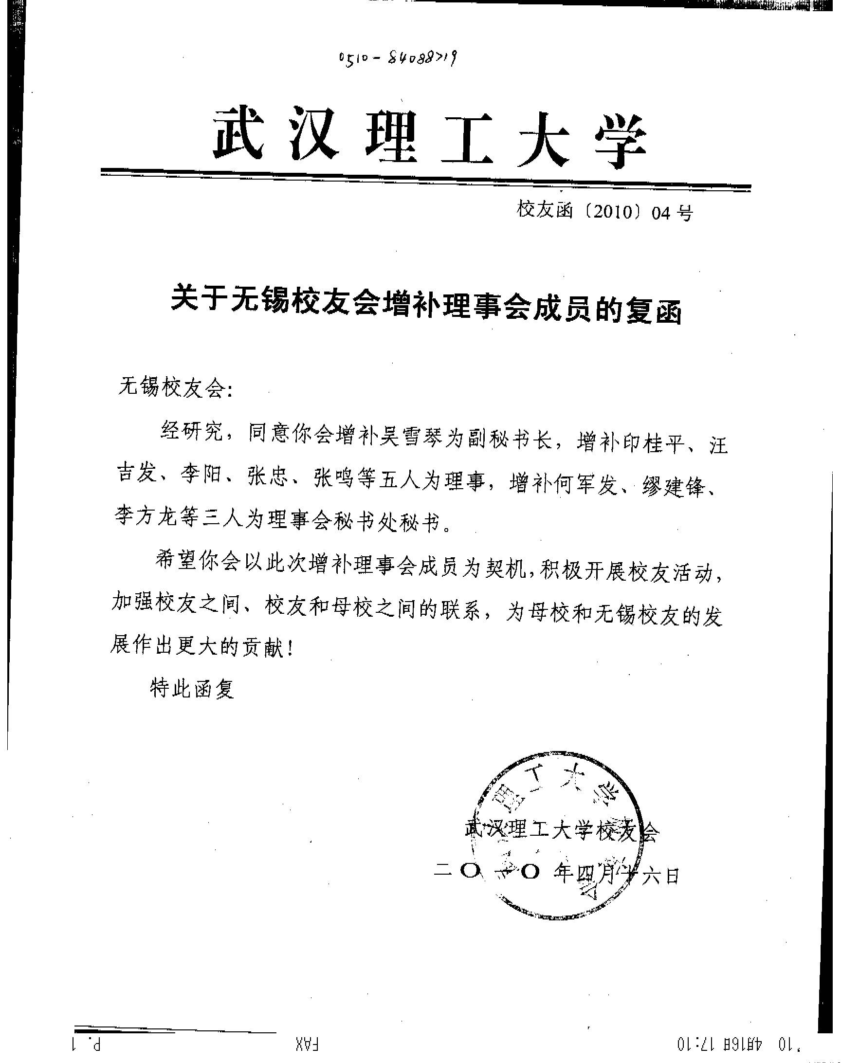 关于无锡校友会增补理事会成员的复函